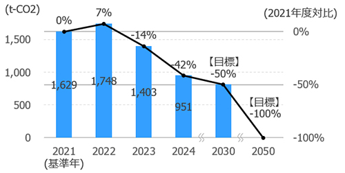 2050年度のカーボンニュートラルを目指して、当社及び国内連結子会社における2030年度の目標を「2021年度対比で50%削減」(マーケット基準)としております。