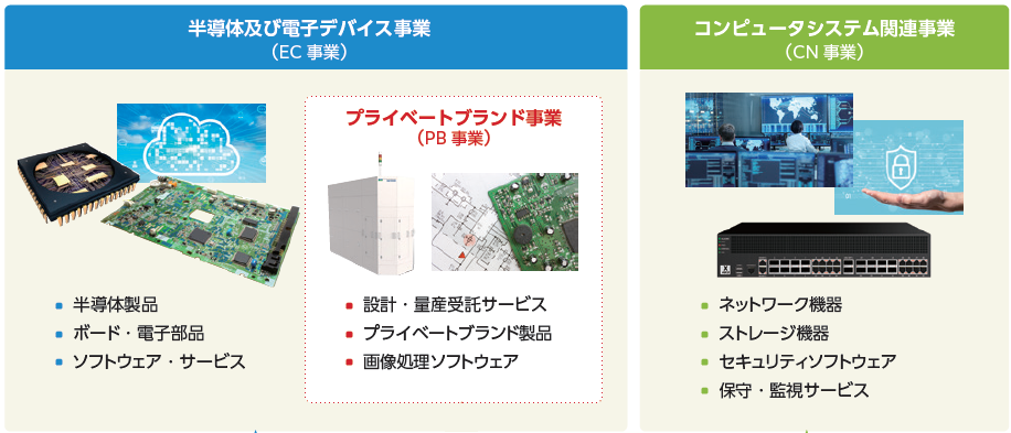 EC事業(半導体及び電子デバイス事業)では、外国製の半導体や、半導体や電子部品を搭載したボード製品を販売しています。当社は商社機能に加えてメーカー機能を有しており、PB事業(プライベートブランド事業)では、お客様の仕様に基づいた製品開発を行う設計・量産受託サービスと自動化・省人化を実現するプライベートブランド製品の開発を行っています。