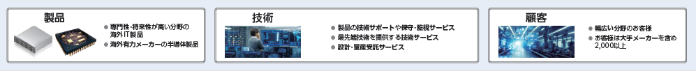 「製品」では、世界有数のメーカーの半導体製品や最先端のIT製品など、競争力のある製品を多数取り扱っていることが強みです。