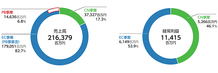 2025年3月期の売上高比率は、CN事業(コンピュータシステム関連事業)が17.3%、EC事業(半導体及び電子デバイス事業)が82.7%、PB事業(プライベートブランド事業)が6.8%でした。セグメント区分では、 PB事業(プライベートブランド事業)はEC事業(半導体及び電子デバイス事業)に含まれています。