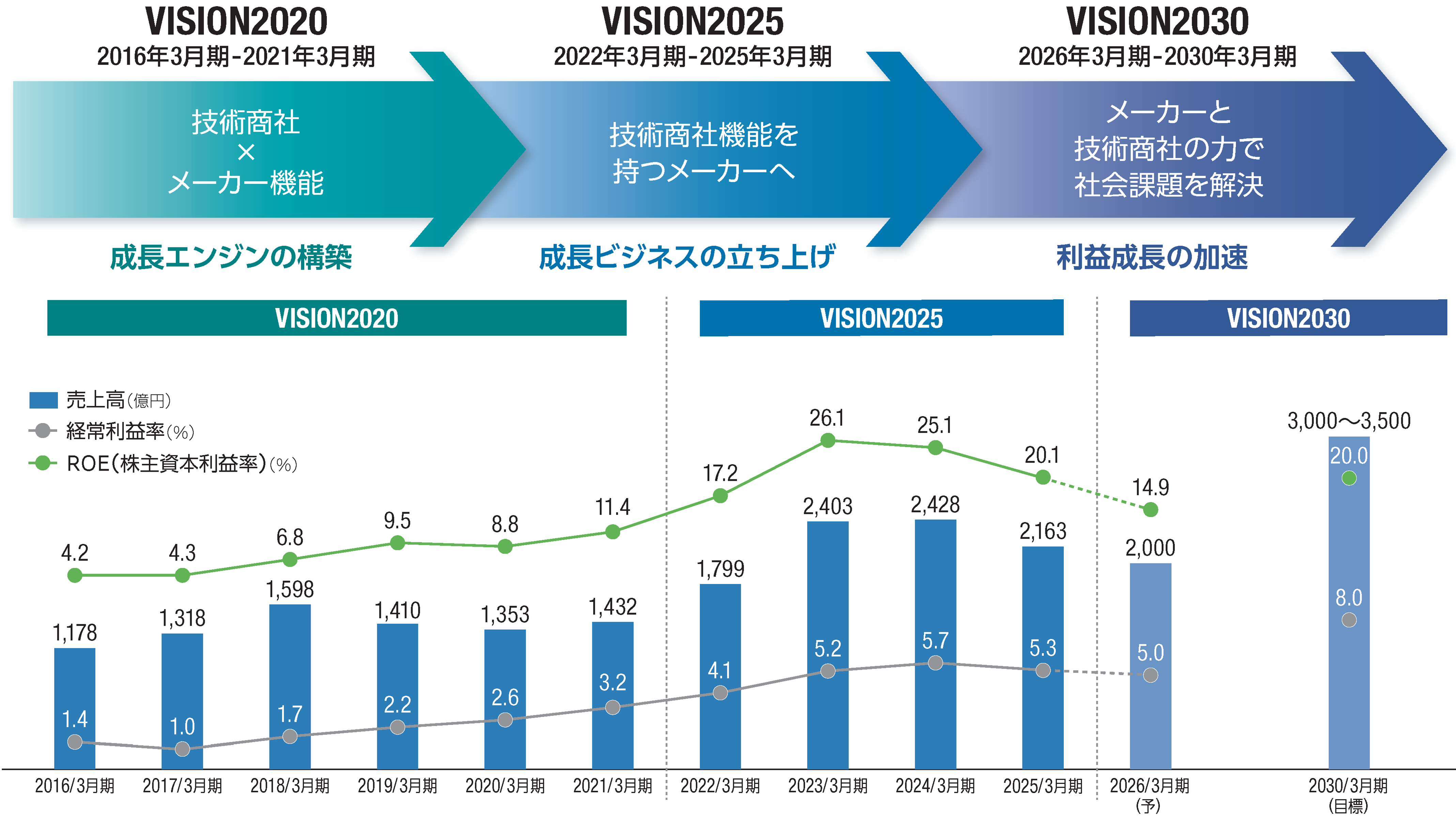 現行の中期経営計画VISION2025においては、「技術商社機能を持つメーカーへ」というVISIONに基づき、課題解決を実現するメーカーとしての力の強化に注力してきました。今後、2030年までには、AIの進展に代表されるような、あらゆる市場を巻き込む課題が数多く発生することが予想され、これまで以上に「メーカー機能」と「技術商社機能」の両面をフル活用することが求められます。新中期経営計画VISION2030では、当社グループがそれらの課題解決を「メーカー機能」と「技術商社機能」の両面から追求していくことを改めて広くステークホルダーの皆様にご認識いただくために、VISIONを「メーカーと技術商社の力で潜在的な社会課題を解決する会社」にアップデートしました。なお、メーカー機能の強化により持続的な収益性向上を実現するという強い決意に変わりはありません。