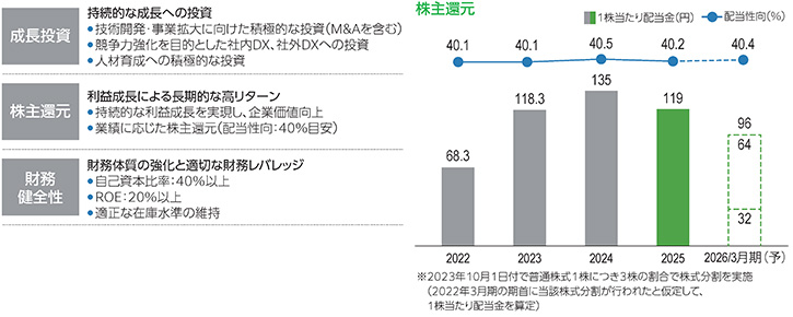持続的な利益成長による企業価値の更なる向上を目指すため、資本政策においては、成長投資、株主還元、財務健全性の3つを重要事項と考えています。