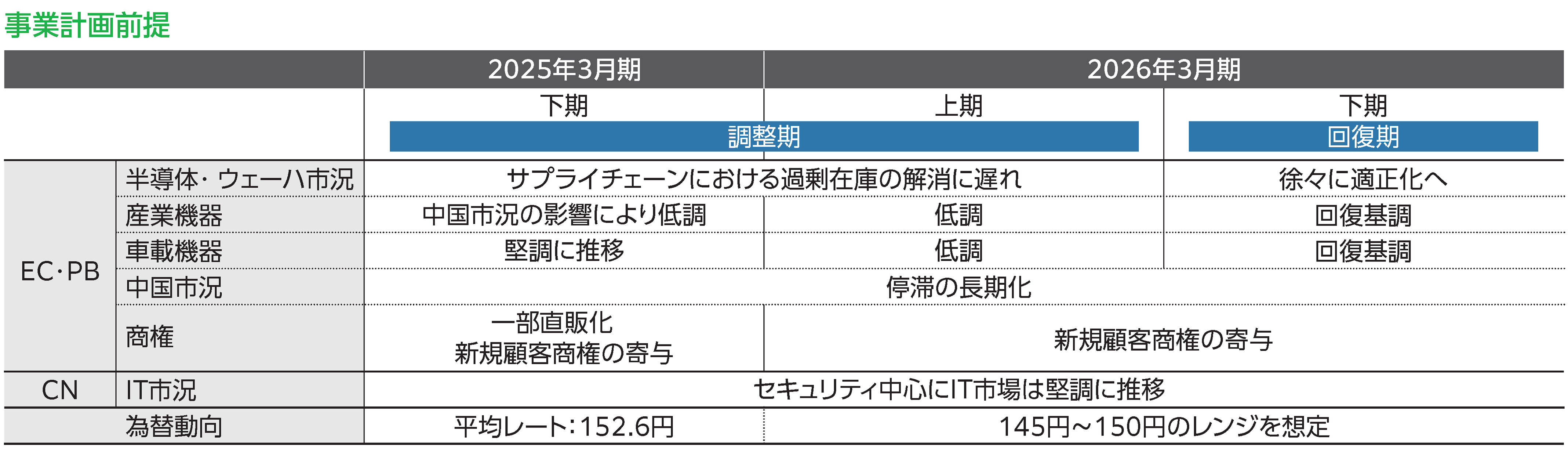 2026年3月期の事業環境は、CN事業はIT市場の堅調な推移を見込んでいます。EC事業・PB事業は、上期も市場の調整が継続し、下期から回復基調へ転換すると想定しています。