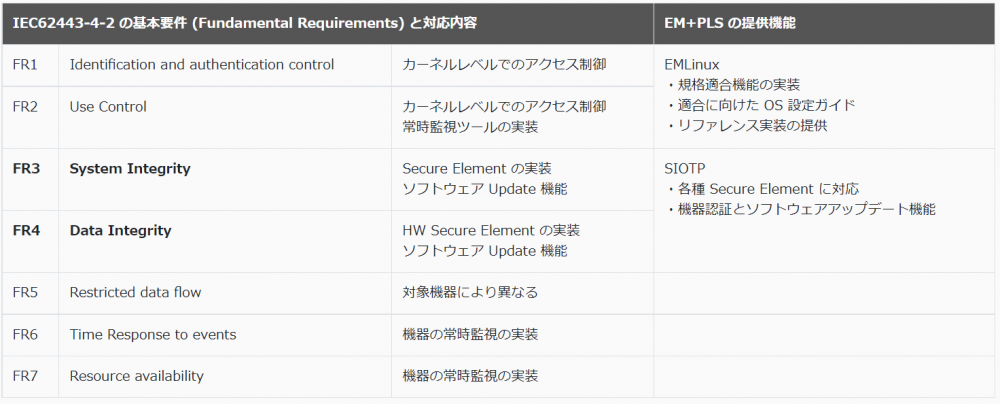 IoT 化が進む産業制御システムでは、サイバー攻撃のリスクに対して国際電気標準会議(IEC)の「IEC62443-4-2」を調達要件に盛り込むケースが海外を中心に増えています。「IEC62443-4-2」に準拠するには一般的なセキュリティソフトをインストールするだけでは不十分で、複数の視点から対応を行うことが求められます。EM+PLS で提供される各サービスは、それぞれが「IEC62443-4-2」に適合するための機能を実装しているため、IoT 機器の認証取得をトータルで支援可能です。